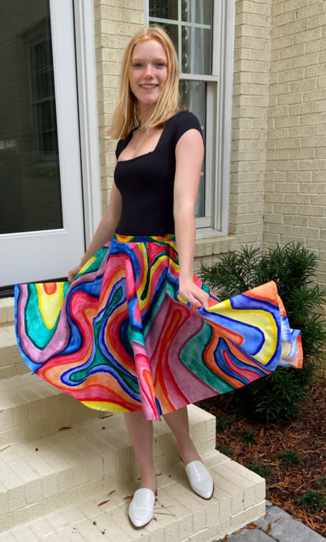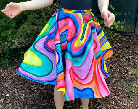 This circle skirt project was designed and hand painted by me. Using oil paint sticks I drew on the many lines, then used a toothbrush to smooth out and spread the pigment throughout the skirt. This skirt turned out to be a bright, vibrant, and colorful piece that is perfect for the spring and summer months, but can also be worn in the fall and winter with a big black sweater and boots!