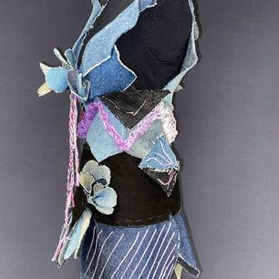 This half scaled denim dress was created by piecing different shapes together to design a unique, Avant Garde look. Each shape was hand sewn and placed meticulously to produce my final product. I was inspired by orchids and butterflies when designing this look, and I think these elements come through in the silhouette, embroidery, and all around vibe of the dress.